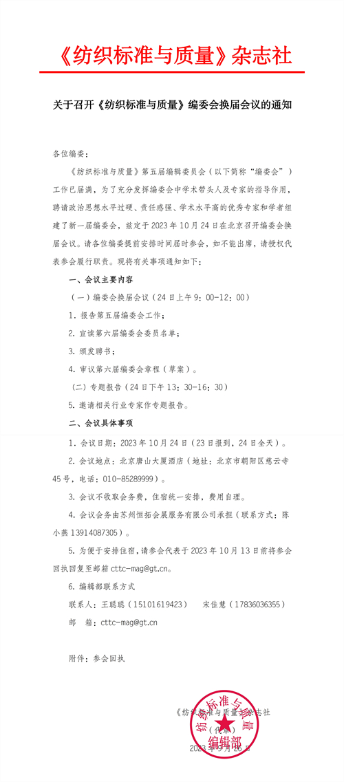 《紡織標準與質量》第五屆編輯委員會(以下簡稱“編委會”)工作已屆滿,為了充分發揮編委會中學術帶頭人及專家的指導作用,聘請政治思想水平過硬、責任感強、學術水平高的優秀專家和學者組建了新一屆編委會,茲定于2023年10月24日在北京召開編委會換屆會議。各有關單位有意參會請按通知報名,具體參會事項及參會回執見附件。