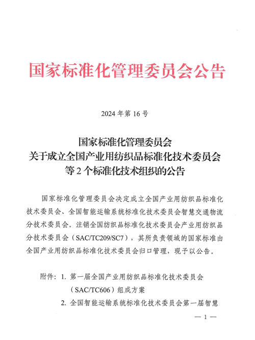 近日,國家標準化管理委員會2024年第16號文發布公告,決定成立全國產業用紡織品標準化技術委員會,編號為SAC/TC 606,英文名稱為National Technical Committee 606 on Technical Textiles of Standardization Administration of China,主要負責產業用紡織品基礎通用、實驗方法、產品性能等領域國家標準制修訂工作。同時注銷全國紡織品標準化技術委員會產業用紡織品分技術委員會(SAC/TC209/SC7),其所負責領域的國家標準由全國產業用紡織品標準化技術委員會歸口管理。