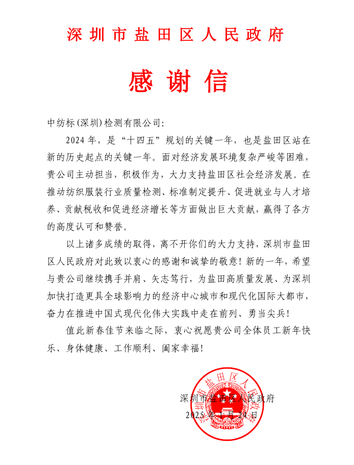 新年伊始,通用技術中紡標(深圳)檢測有限公司(以下簡稱“深圳中紡標”)收到了深圳市鹽田區人民政府的感謝信,對2024年深圳中紡標在面對經濟發展環境復雜嚴峻等困難,主動擔當,積極作為,助力鹽田區社會經濟發展,在推動紡織服裝行業質量檢測、標準制定提升、促進就業與人才培養、貢獻稅收和促進經濟增長等方面給予了充分肯定和高度評價。